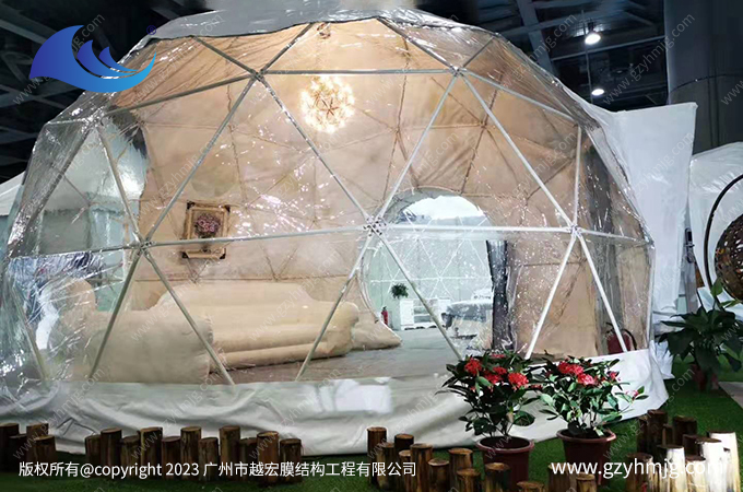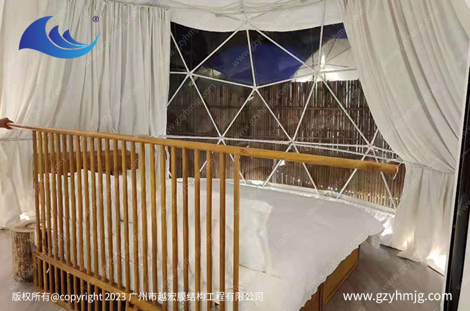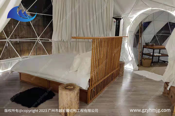 現在我們就看看江西某旅游景區所搭建的球形帳篷酒店,以半透明為主, 為客群提供高質量的帳篷住宿體驗,讓旅客置身自然之中,無時無刻不被大自然的天籟之音和靜謐環境所包圍。越宏按照需求設計出一套直徑10米左右的球形帳篷酒店,內部配套齊全,有桌椅、睡床、衣柜、沐浴間等等,透明篷布部分設計是為了更好的觀賞戶外風景,以及在夜晚時刻能躺在床上觀望天上星星相伴入睡。帶來有更舒適的睡眠效果。